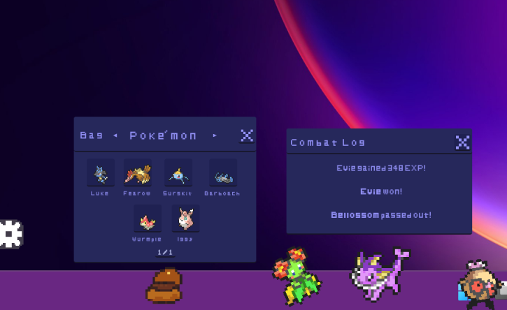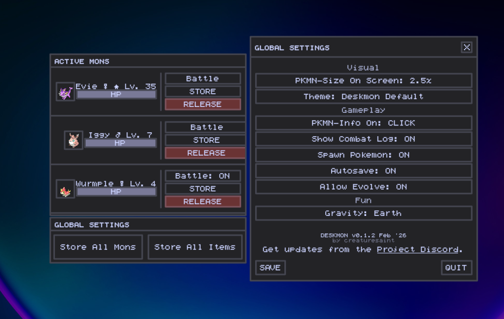 The window sits on top of your other windows at all times as your mons wander the bottom of the screen. You control everything with your mouse!